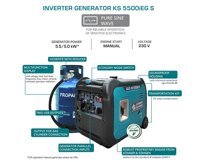 גנרטור מושתק אינוורטר מנוע בנזין משולב גז 5500W חד פאזי מבית Könner & Söhnen גרמניה